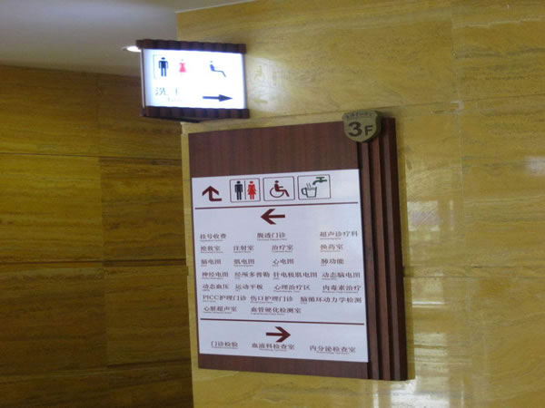 墻牌(立牌)需要平視,比較符合人的視覺習慣,是醫院出現較多的標牌形式。墻牌可大可小,關鍵是要把引導的部分寫清楚,相對于吊牌和地標,墻牌應該也具備詳細、完整的特性。針對不同區域,墻牌應在其完整性與指向性上做到遞進統一,即按層級設置,完成院、樓、層、區到具體科室的分級指引,設置醉佳路徑,以方便患者尋找。
